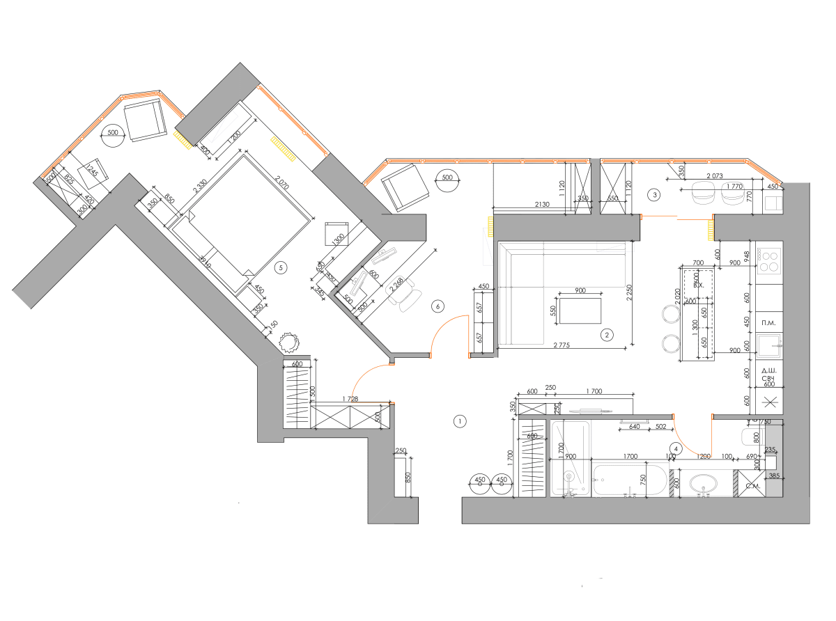 Мы перепланировали квартиру таким образом, что получилась довольно просторная кухня-студия, где даже поместился кухонный остров, большая спальня с гардеробной комнатой, не большой кабинет, который при необходимости может превратится в детскую комнату и функциональная ванная комната.